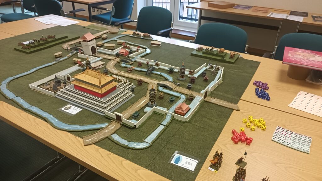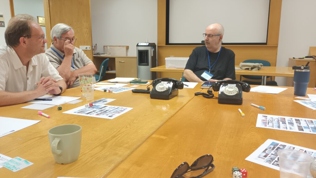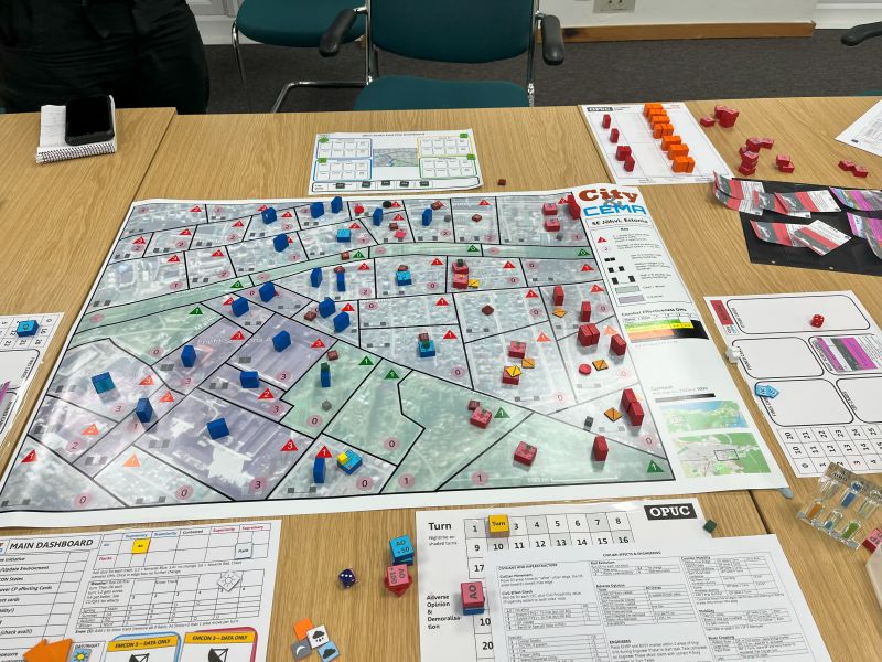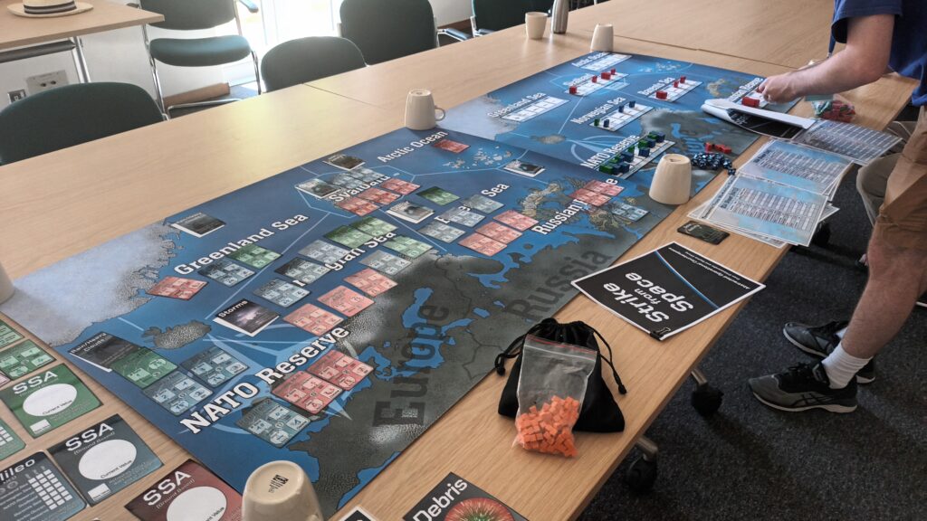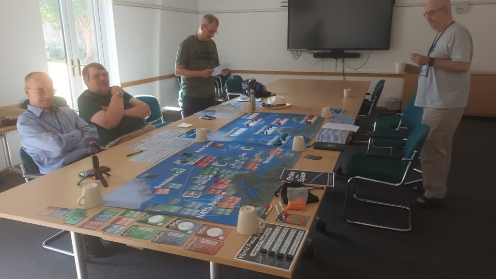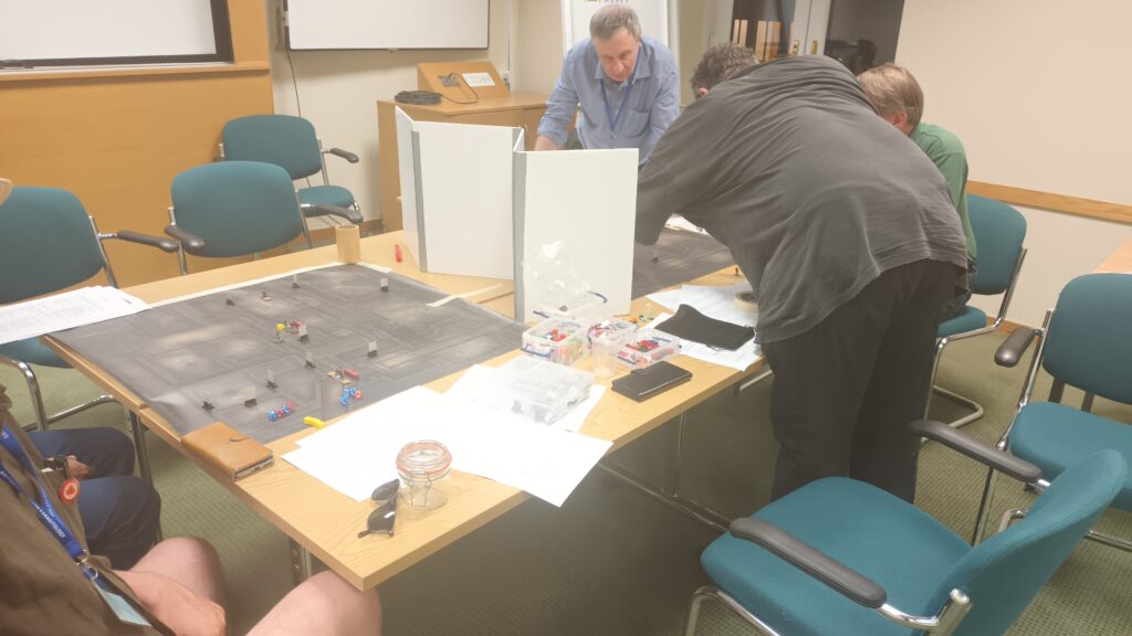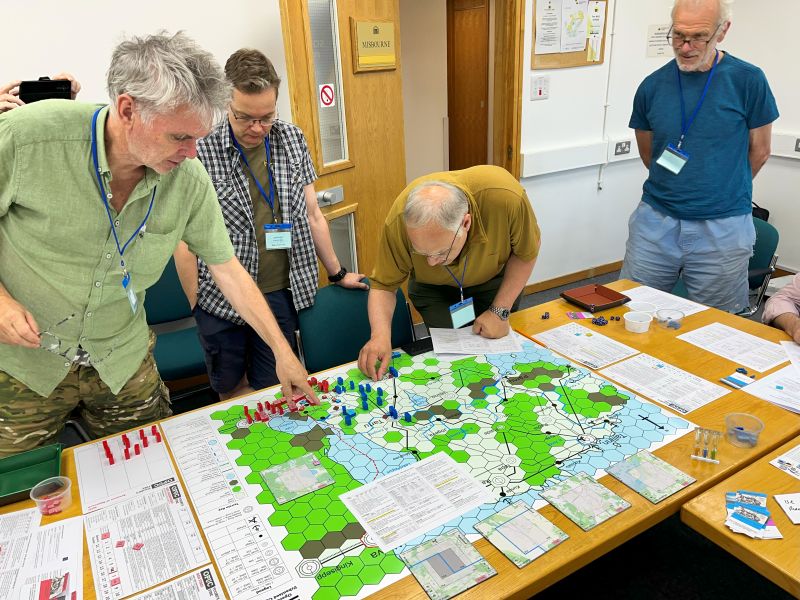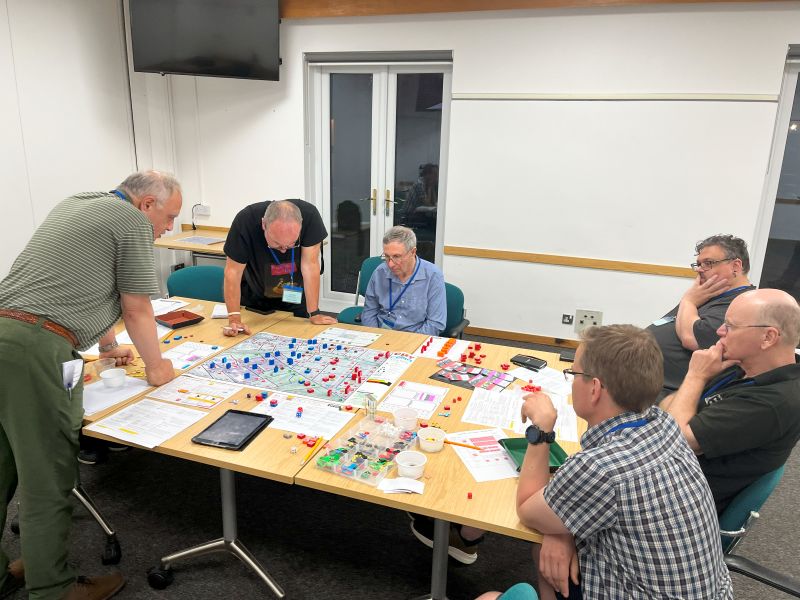 On Friday there is traditionally a plenary game to act as an ice-breaker. This time it was called Apocalypse Dilemmas and was (topically) World War 3 (worrying given how prescient last year's Papal Conclave was). The game was designed by and inspired by SPI's classic boardgame of the same name. Attendees played different command and staff positions from NATO and the Warsaw Pact and each team was faced with a variety of global incidents (typically military) to which they had to decide whether they would deal with them by conventional or nuclear means. As it was everyone kept their head and no nuclear weapons were used by either side. Quite a sobering game. After dinner there were half a dozen smaller and more informal/fun games run, some pictures of those below.